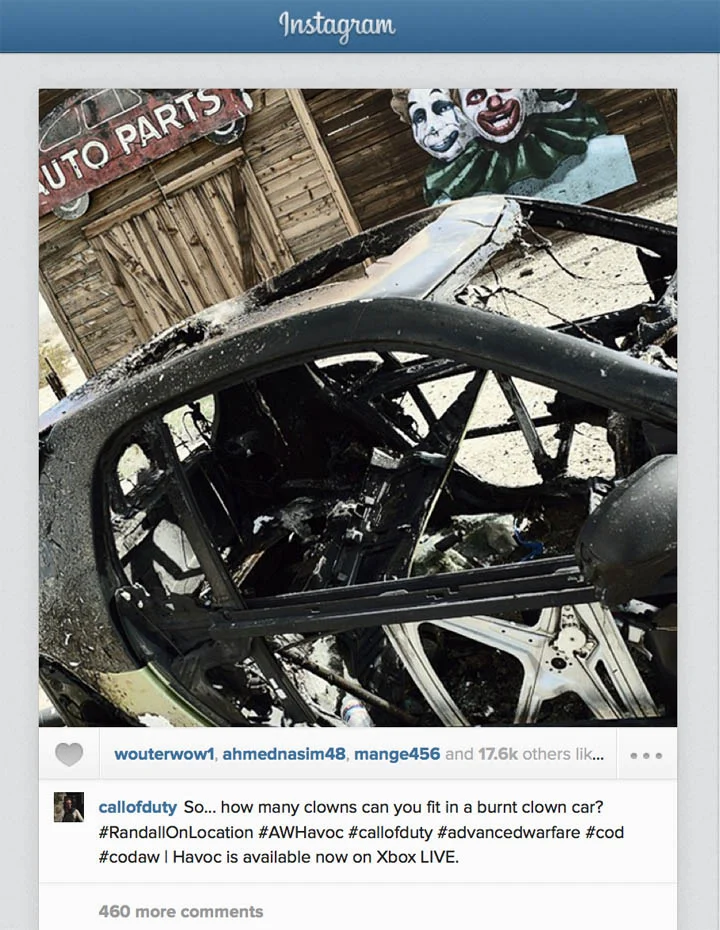 For Call of Duty Advanced Warfare, 72andSunny orchestrated an epic campaign centered around the fictional Randall Higgins, a "KillCameraman" who captured the endless deaths within the game. So we expanded on the character and his world through an Instagram takeover that teased the main TV spot and gave Randall a new place to flex his uber-macho personality.